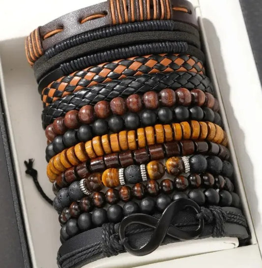12-Piece Men’s Bracelet Set – Leather & Beaded Stack Style