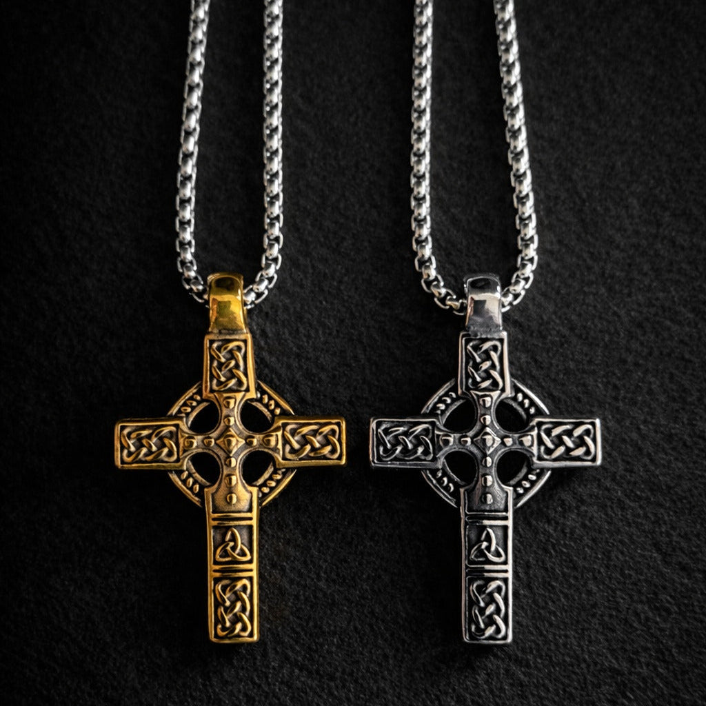 Celtic cross crafted in premium stainless steel, water-resistant and tarnish-free. Its knotwork symbolizes protection and eternal connection. A strong, meaningful accessory for everyday wear.