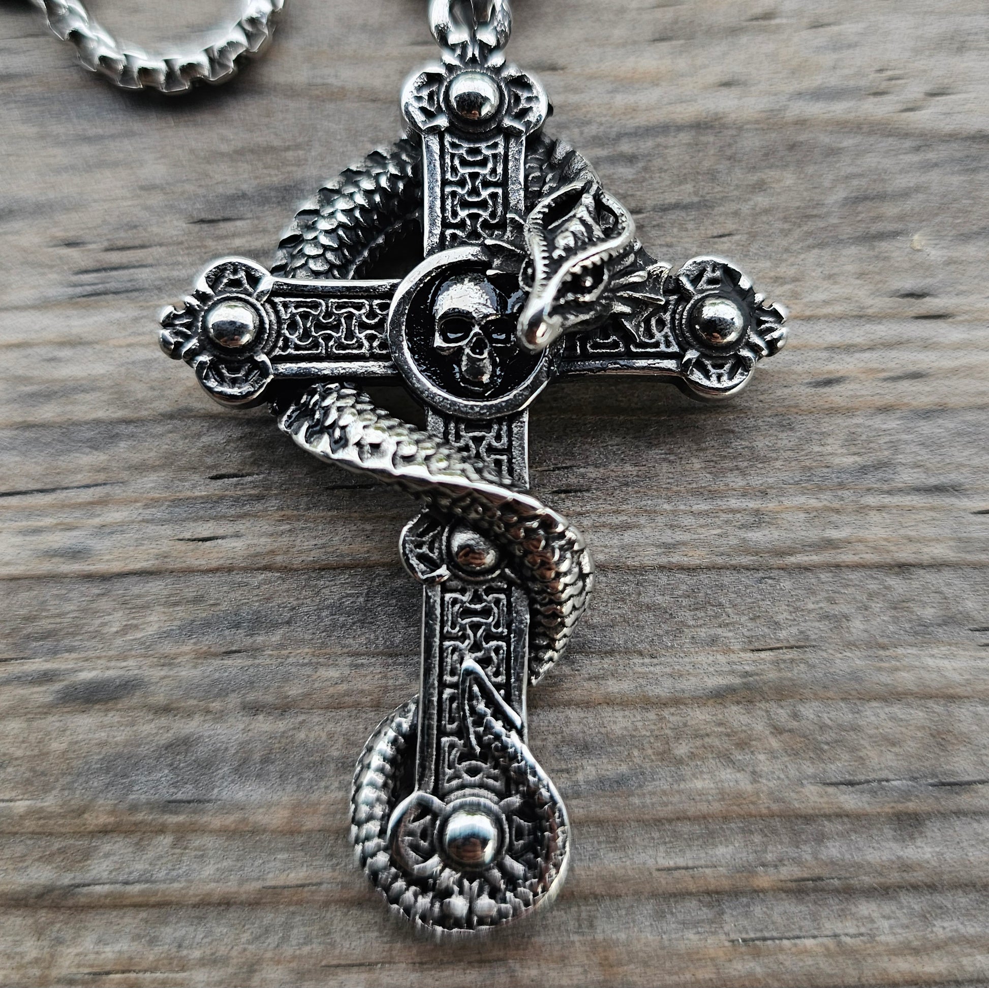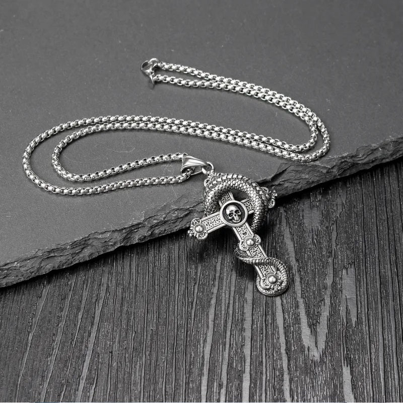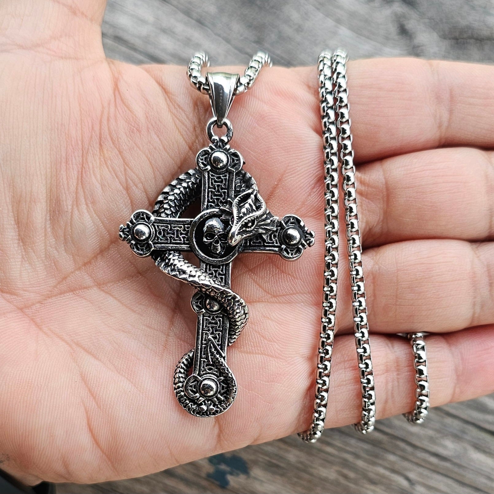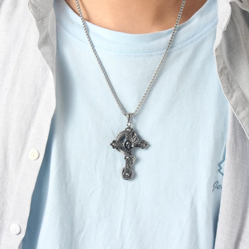 Men's necklace featuring a bold design with a dark skull, dragon, and cross, perfect for those who love Hip Hop and Retro style. Made from 304 stainless steel, this durable and sturdy pendant is ideal for daily wear, adding a striking touch to any outfit. Both the chain and pendant are crafted from high-quality stainless steel, ensuring durability and a standout look. Weighing 21g, it's a lightweight yet eye-catching accessory, perfect for making a statement with personality.