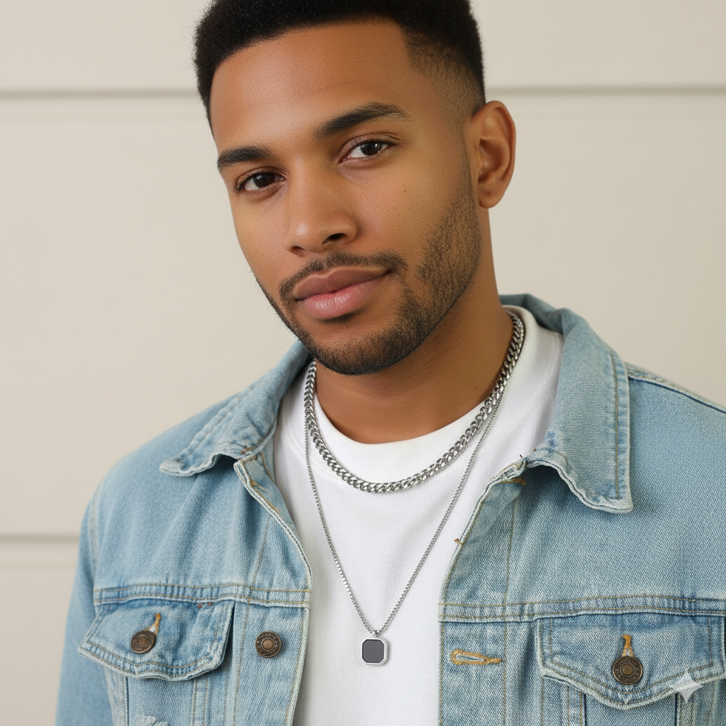 This elegant square necklace for men combines classic and casual style through its clean geometric design. Crafted from durable 201 stainless steel, it features a square pearl chain that offers both strength and refined simplicity. The pendant and chain share the same high-quality material for a cohesive look. Lightweight at just 9g and equipped with a secure lobster trigger clasp closure, this necklace is comfortable for all-season wear, making it a versatile addition to any gentleman’s collection.